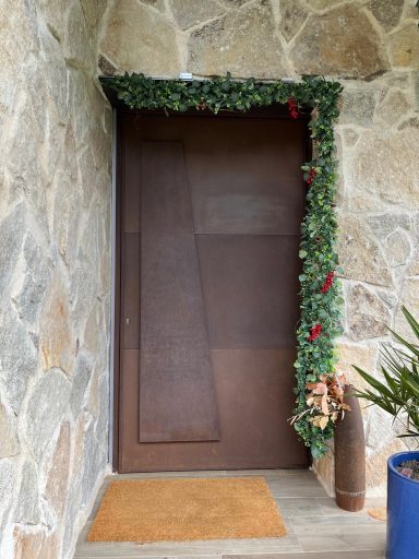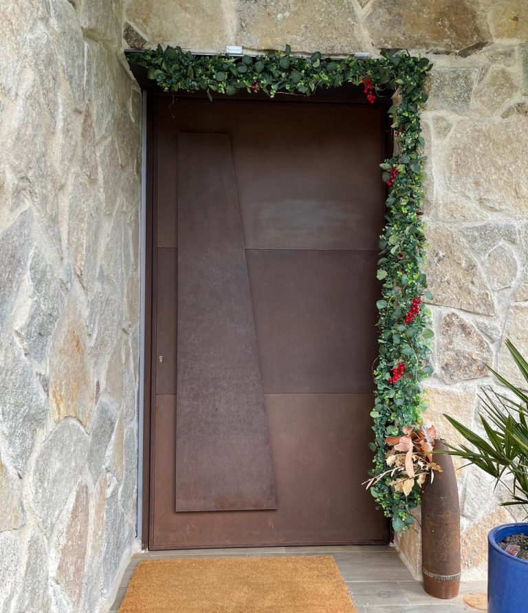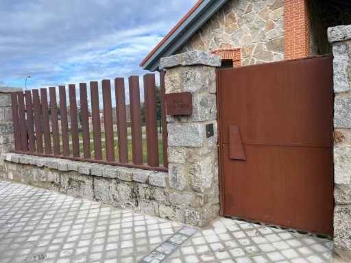 Cerramiento de parcela de chalet fabricado en lamas verticales de chapa y puertas ciegas, todo ello oxidado en taller.