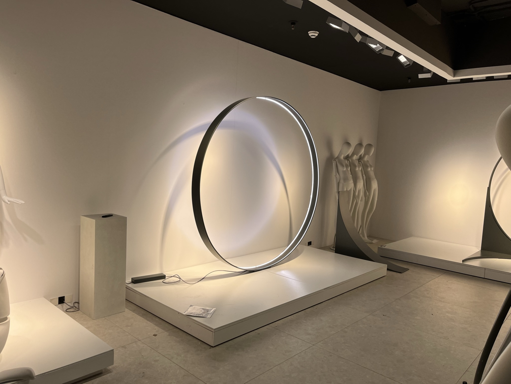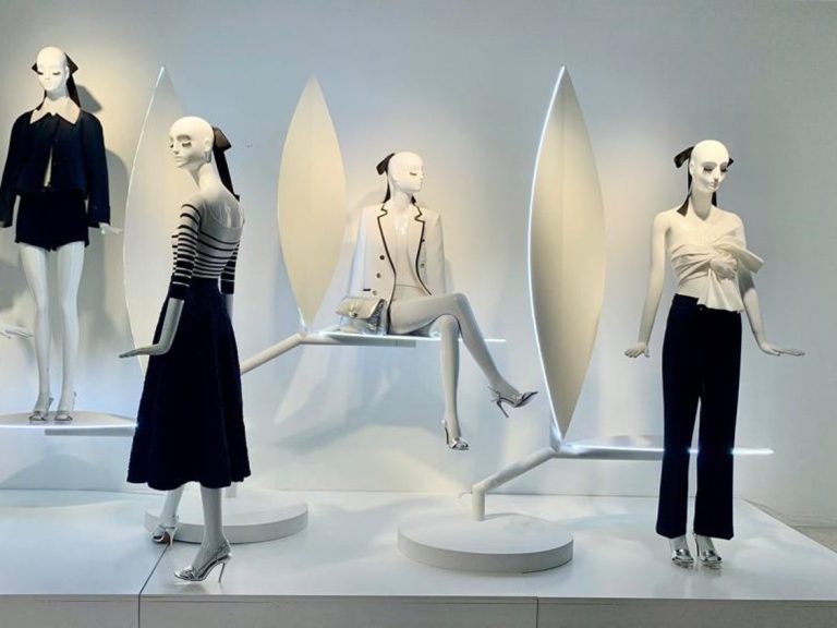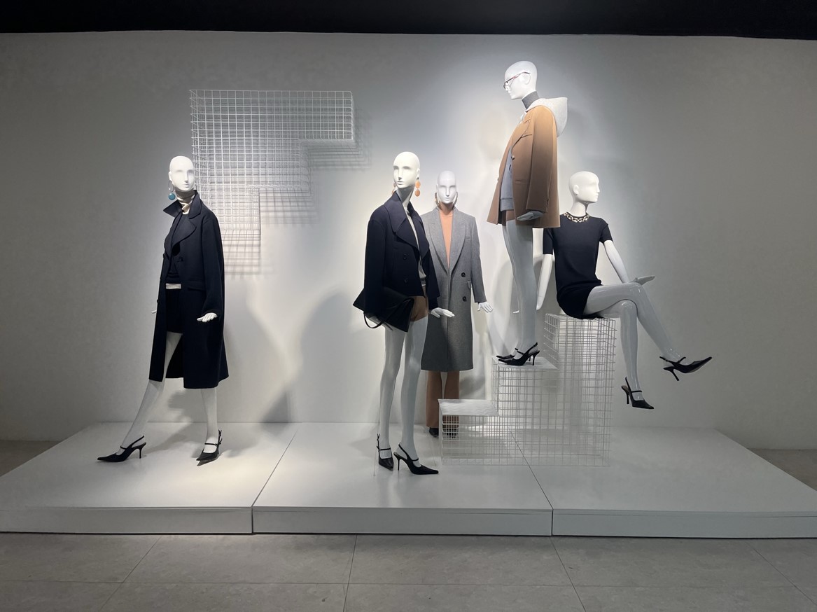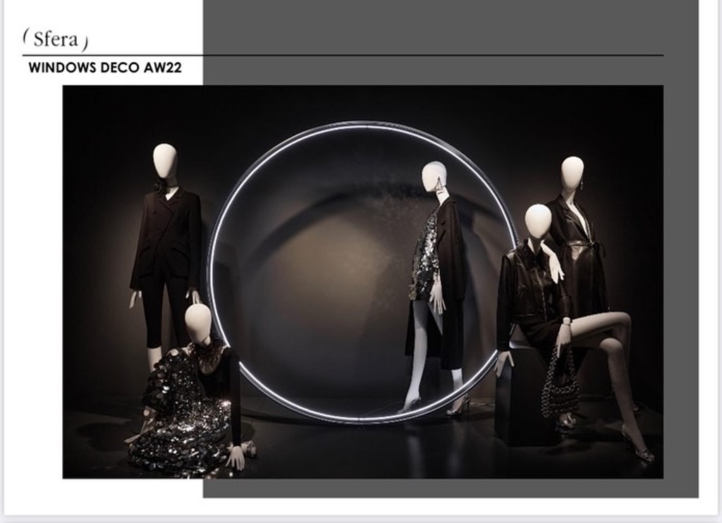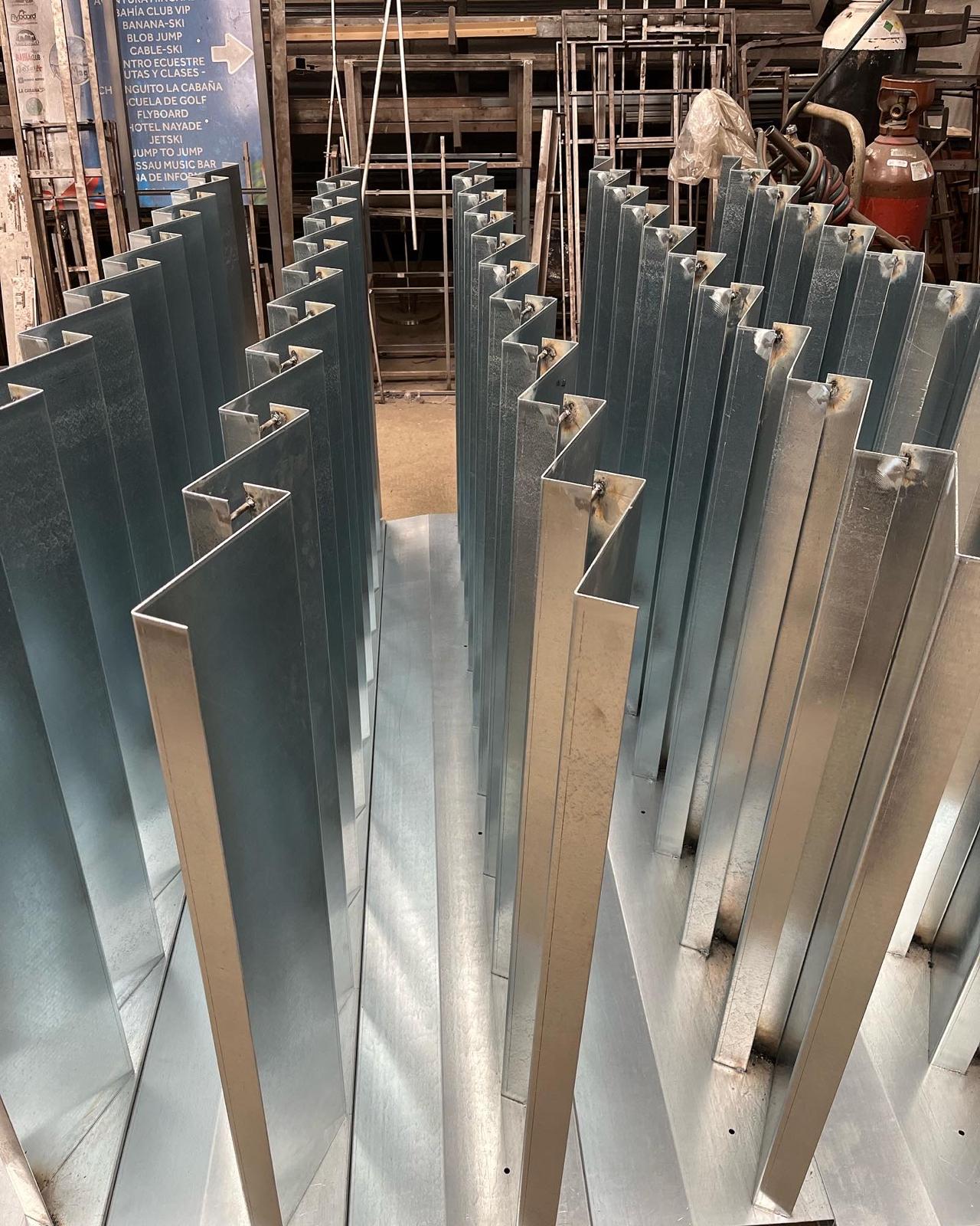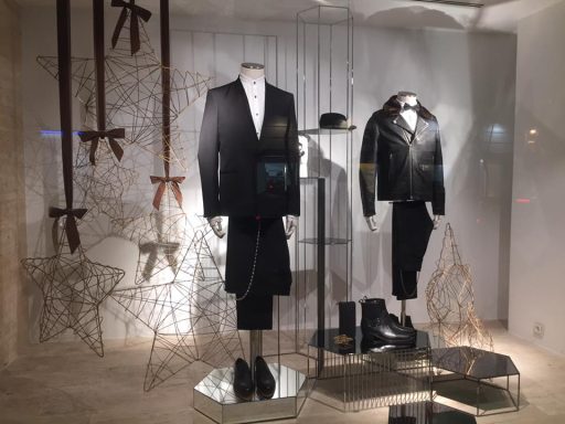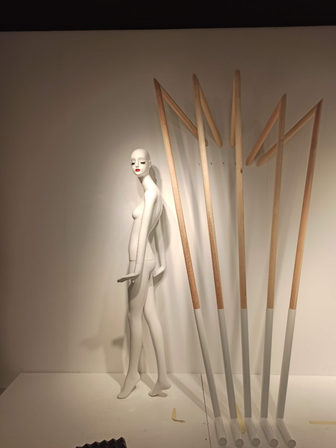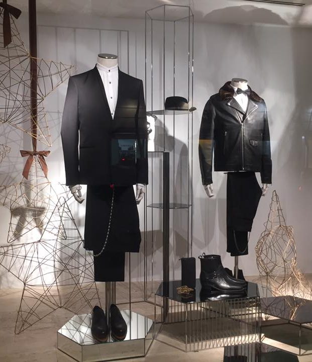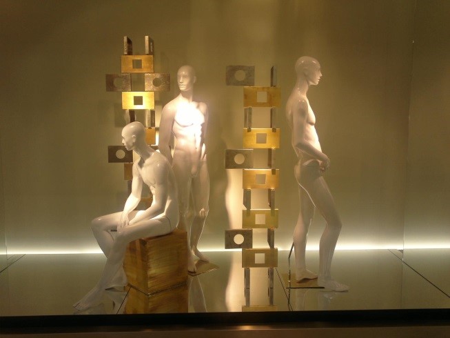 Diferentes elementos para escaparates realizados en metal, tanto en hierro lacado al horno como pulido y latonado o cromado.